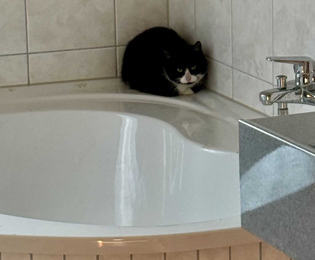 Er starrt mich verängstigt an. Und bleibt eisern auf der Badewanne sitzen.