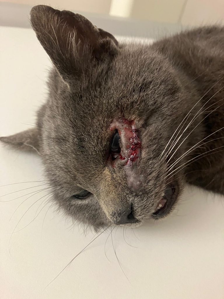 Darauf der Kopf der – offensichtlich narkotisierten – Mutterkatze. Und eine genähte Wunde am linken Auge.