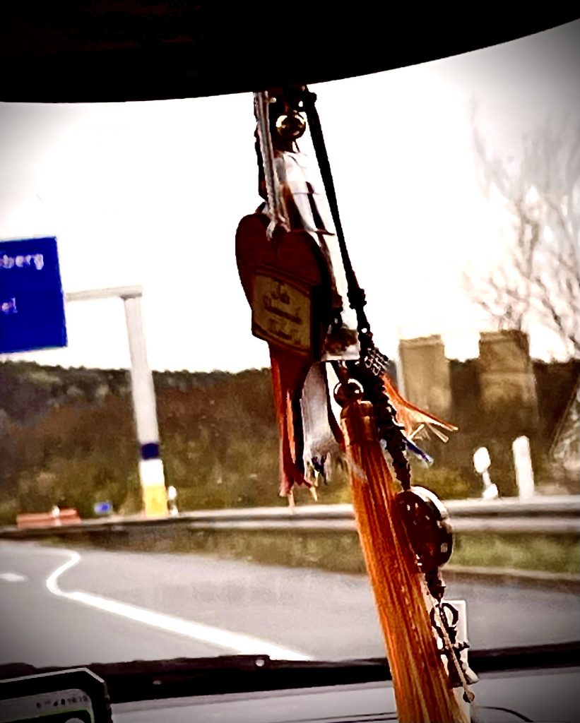 Sie soll ihn niemandem präsentieren, schärfe ich ihr noch ein. Tantra-Magie wirkt nur, wenn sie geheim gehalten wird. Deshalb ziert auch kein Foto des Anhängers diesen Blogtext. Statt dessen muss ein Bild von Suriyels Devotionalien-Sammlung herhalten, mit der er den Rückspiegel seines Autos dekoriert hat. Ich habe das Bild während der Fahrt ins Retreathaus ans Ende der Welt aufgenommen. Wir kamen bei Einbruch der Dunkelheit an, von Uriel freudig in Empfang genommen. Suriyel und ich geschützt durch unsere Praxis – und Maria durch einen kleinen billigen Plastikanhänger „Made in Nepal“.