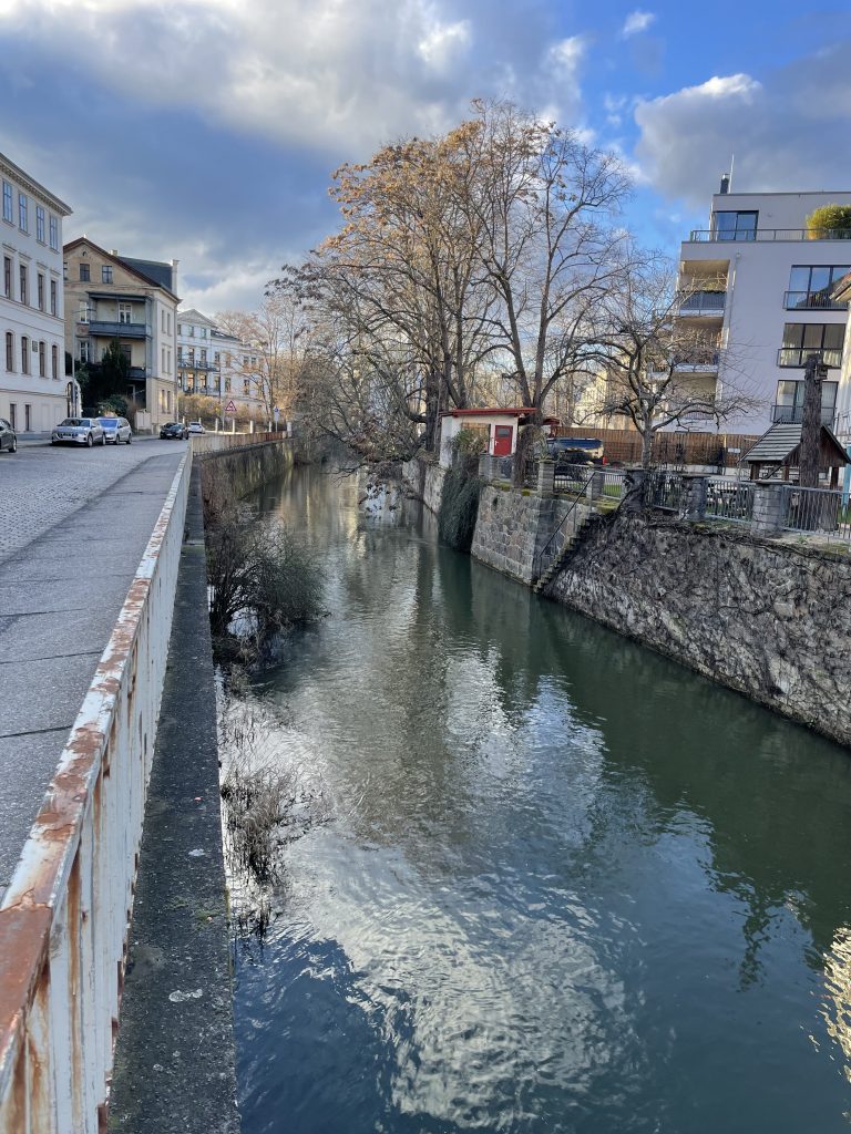 Eine Stunde später wandern wir gemeinsam durch den Kiez. Vorbei an der Gethsemane-Kirche schiebe ich mein Fahrrad, danach über den Weihnachtsmarkt in den Höfen der Kulturbrauerei. Wir kreuzen die Schönhauser Allee. Über unseren Köpfen rauscht auf hohen Metallstelzen die U-Bahn in Richtung Alexanderplatz.