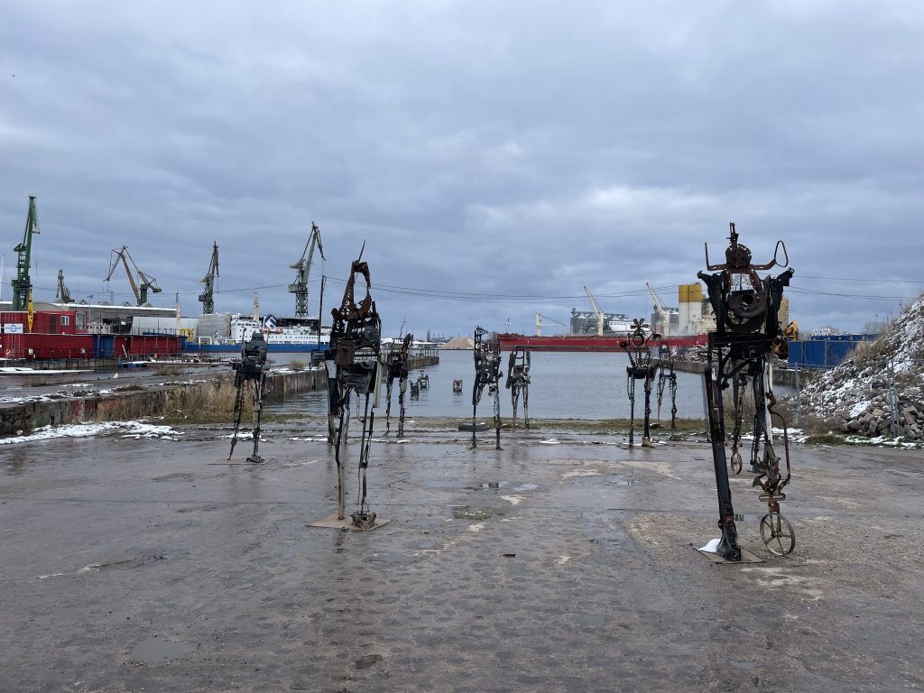 Ein paar Meter von der Immobilien-Schautafel entfernt entdecke ich Kunst: Riesige Figuren aus Metallschrott wanken aus dem Hafenbecken an Land. Der Kommentar eines Gdanzger Künstlers zu was? Sowjetischem Imperialismus? Immobilienhaien? Reichen Russen? Oder einfach nur Deko, mit der sich die Immobilien-Kundschaft schmückt?