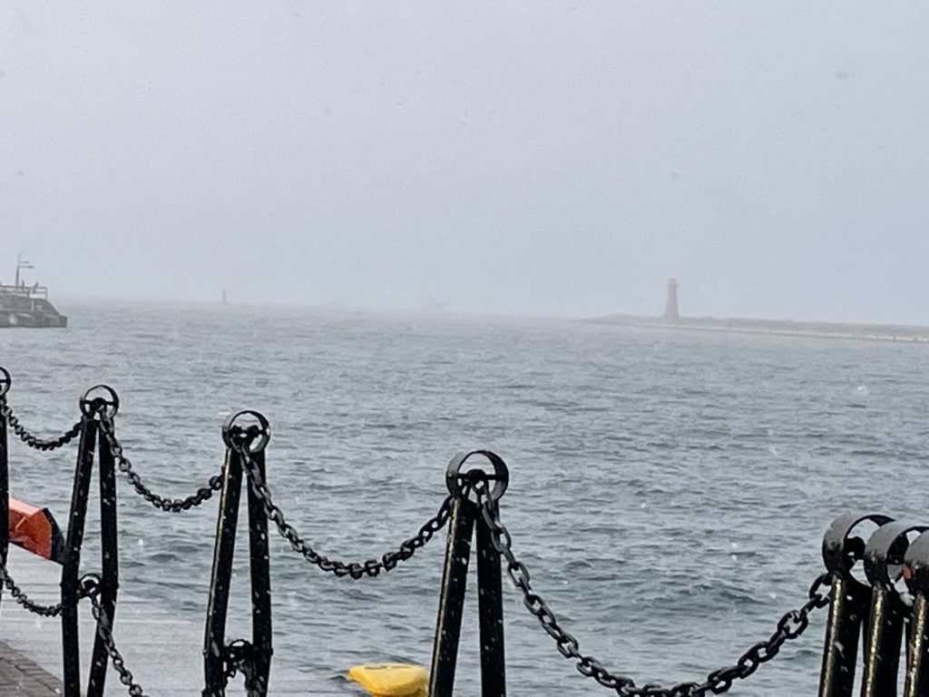 Es geht über mehrere Kilometer Richtung Norden. Ich könnte genauso gut die S-Bahn nehmen, sie fährt in regelmäßigen Abständen auf der anderen Seite der vierspurigen Stadtautobahn an mir vorbei, aber nein, ich muss laufen, warum auch immer. Der nasse Schnee klatscht mir ins Gesicht, außer mir ist niemand zu Fuß unterwegs. Irgendwann wieder ein Neubaugebiet, die selben verklinkerten Appartementblöcke mit den gläsernen Balkonen. „Lighthouse“ lese ich auf einem Wegweiser. Das klingt nach Hafen, ich schlage den Weg nach links ein und tatsächlich, auf einem Hügel ragt ein altertümlicher Leuchtturm in die Höhe. Als ich an ihm vorbei laufe, lässt sich auf dem schneebedeckte Dach des großen langgestreckten Gebäudes ein riesiger Schwarm Aaskrähen nieder. Ihr lautes Krächzen übertönt das gleichmäßige Klatschen der Wellen an der Kaimauer.