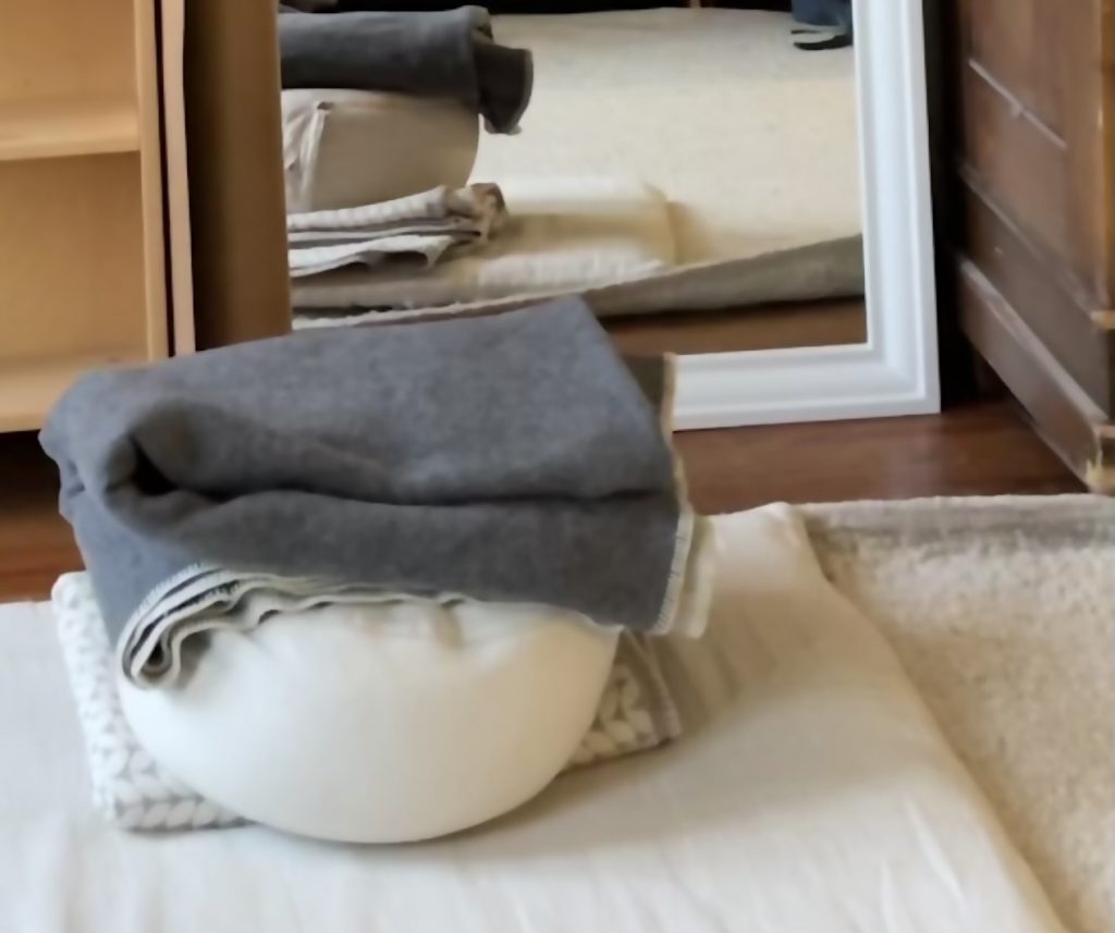 Ich vermisse mein Zafu, mein Sitzkissen. Morgens um sechs staple ich alles, was das Mini-Appartement an Kissen zu bieten hat, auf dem Schlafsofa, nehme irgendwie oben drauf Platz und wähle mich zur täglichen Morgenmeditation mit meiner Online-Sangha ein. Pünktlich um 6:10 Uhr erscheint die Zen-Lehrerin auf meinem Handy-Bildschirm, um 6.15 Uhr erklingt drei Mal der großen Gong, das Zazen beginnt. Wir meditieren 45 Minuten. Den Abschluss bildet ein kleines Ritual: wir rezitieren gemeinsam das Herz-Sutra, gefolgt von einem Tesho – dem traditionellen Vortrag des Lehrers/der Lehrerin – in diesem Fall ist es ein kurzer Tagesimpuls.