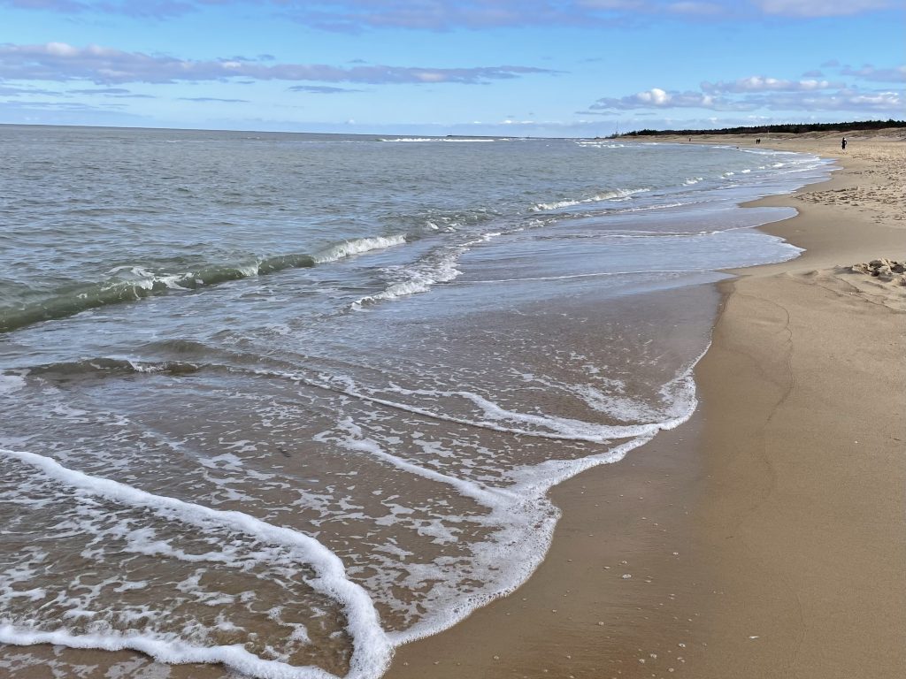 Heute ist der Parkplatz vor dem Deich fast leer. Kein Wunder, es ist Montagmittag, das letzte Mal war ich an einem Sonntagnachmittag hier. Es sind nur ein paar Meter, dann breitet sich der riesige Strand vor mir aus. Ich laufe quer durch den Sand zur Brandung. Es ist gerade Ebbe, am nassen Saum der See entlang zu laufen macht Spaß und ist nicht so anstrengend wie durch den trockenen Sand. Als ich – auf einem Bein balancierend – den Sand aus einem Schuh kippe, kommt eine große Welle, schwappt über meinen Fuß, vor Schreck verliere ich das Gleichgewicht. Erkenntnis: so kalt ist sie garnicht, die Ostsee. Mit nassen Socken und Schuhen laufe ich weiter, es tut der Freude keinen Abbruch.