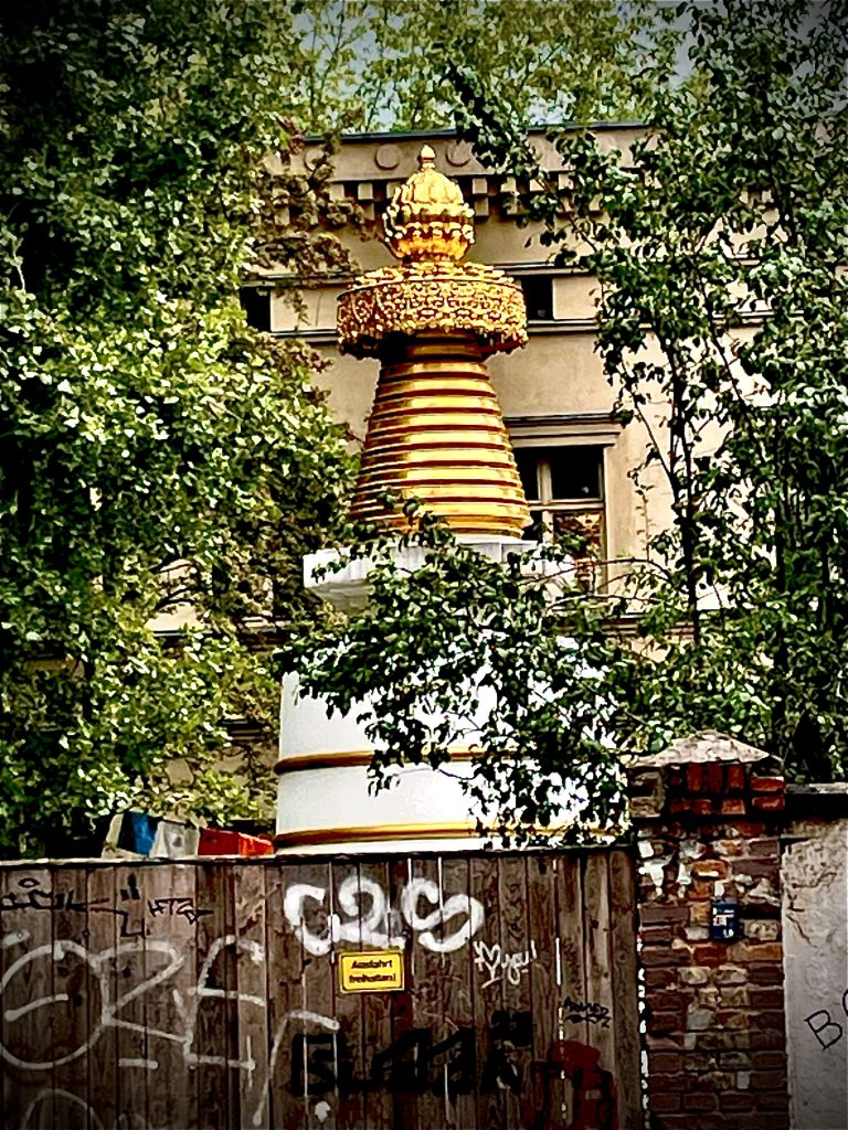 Der junge Han-Chinese in Jeans und Freizeitjacke lief neben dem großen schwarzen Kater die Straße entlang. Er hob erstaunt den Kopf: auf der gegenüberliegenden Seite leuchtete hinter einem mit Graffiti besprühten Bauzaun die goldene Kuppel einer Stupa.