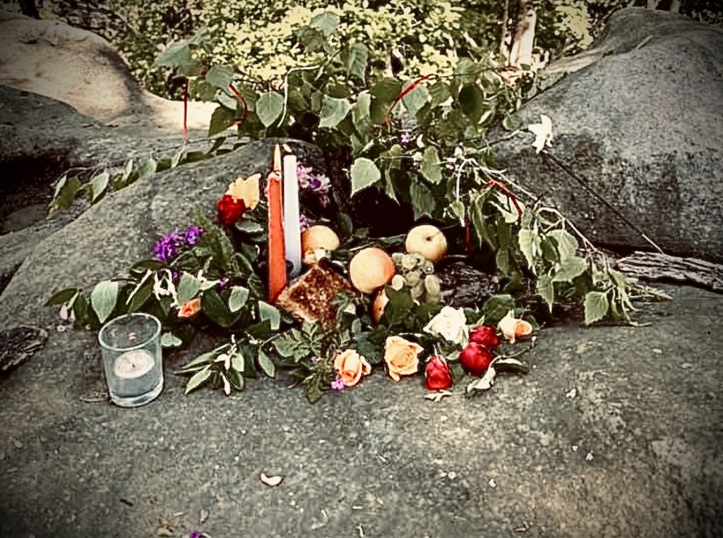 Die Hexe aus dem Harz hat heute Morgen ein Foto gepostet: Ein grauer Felsen, auf dem sie kunstvoll Blumen, Obst und Kerzen drapiert hat. „Herzlicher Mabon!“ steht darunter.