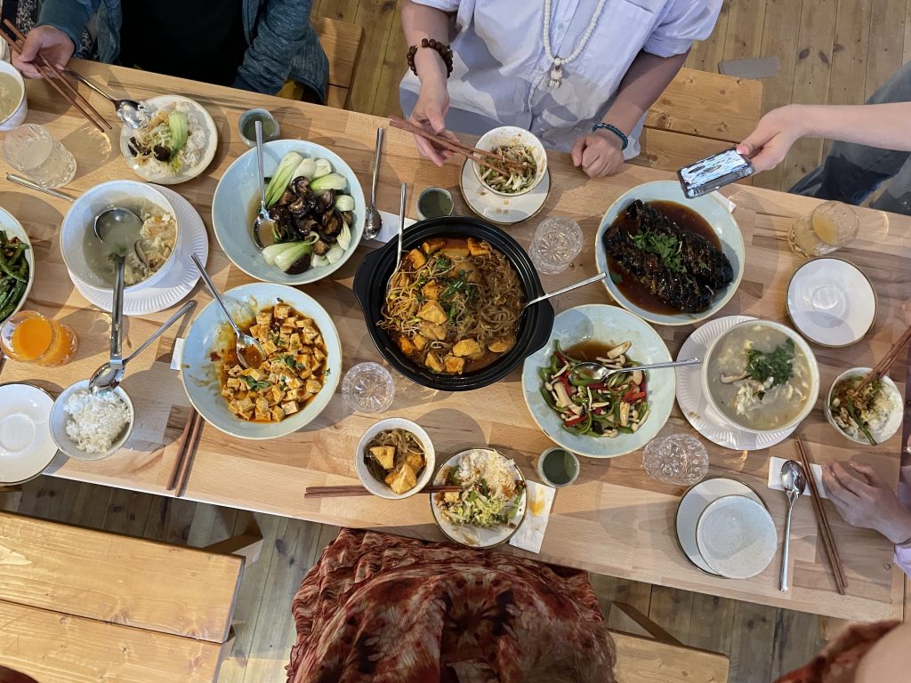 Glücklicherweise ist das Essen fertig. Wir lassen uns an einer großen Tafel nieder. Lu stellt eine große Schüssel mit köstlichen chinesischen Gemüsegerichten nach der anderen vor uns auf den Tisch. Dazu gibt es fantastischen chinesischen Grünen Tee.