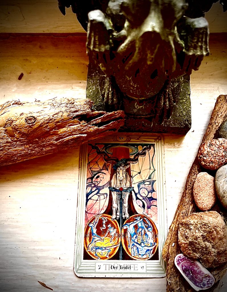 Der Bedeutung des schrägen Traums beschäftigt mich so sehr, dass ich nicht wieder einschlafen kann. Schliesslich gebe ich auf, schalte das Licht an, stehe auf und blättere schlaftrunken am Bücherregal ein paar Tarot-Bücher nach der Bedeutung des „Teufels“ durch. In einem der Bücher werde ich fündig. In einer langen Liste, wofür „Der Teufel“ stehen kann, stoße ich auf „Schicksalsgemeinschaft“.