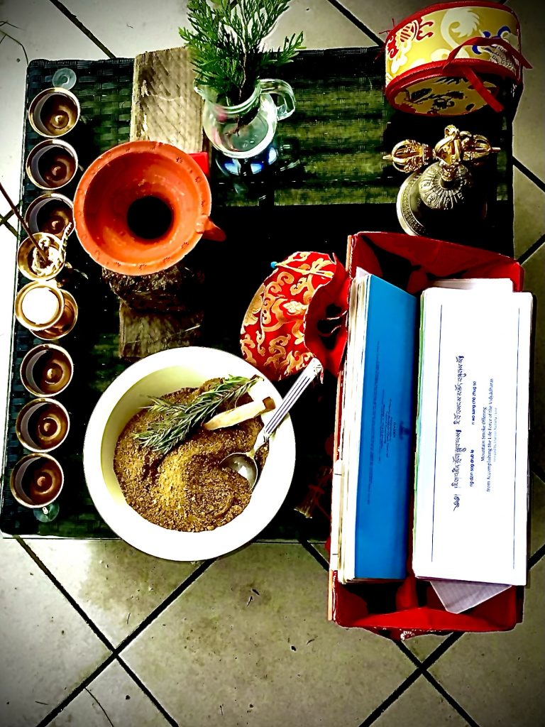 In der Mitte des Tisches wird ein kleines Tonschälchen mit Räucherkohle platziert. Darin wird später das Speiseopfer – eine Mischung aus Mehl, Zucker, Honig, Melasse, Butter und Öl – verbrannt werden. Mit der kleinen Damaru – einer tibetischen Handtrommel – und der Glocke wird das Ritual musikalisch begleitet. Der immergrüne Ast in der Glaskanne wird traditionell benutzt, um die Opfergaben mit geweihtem Wasser zu besprengen. Bei uns ist er Deko – er gehört halt auch dazu.