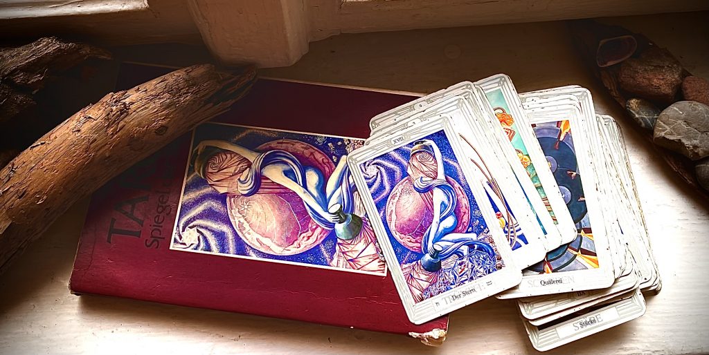 Die mich – im Gegensatz zur Meditation – Zeit meines Erwachsenenlebens begleitet. Ich war achtzehn, als ich das erste Mal im Leben die Karten gelegt bekam. Von der Freundin einer Schulkameradin. Eine zufällige Begegnung, die tiefe Spuren hinterließ. Am nächsten Tag besorgte ich mir mein erstes eigenes Kartenset.