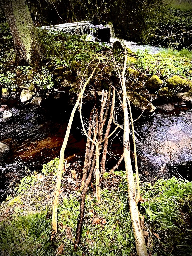 Ich drehe vorsichtig um. Jetzt geht es abwärts, der Bach hat an dieser Stelle ein spürbares Gefälle und noch dazu drückt die Strömung von hinten gegen meine Waden. Schritt für Schritt bewege ich mich auf die provisorische Brücke zu, die vom Ufer auf die kleine Insel führt.