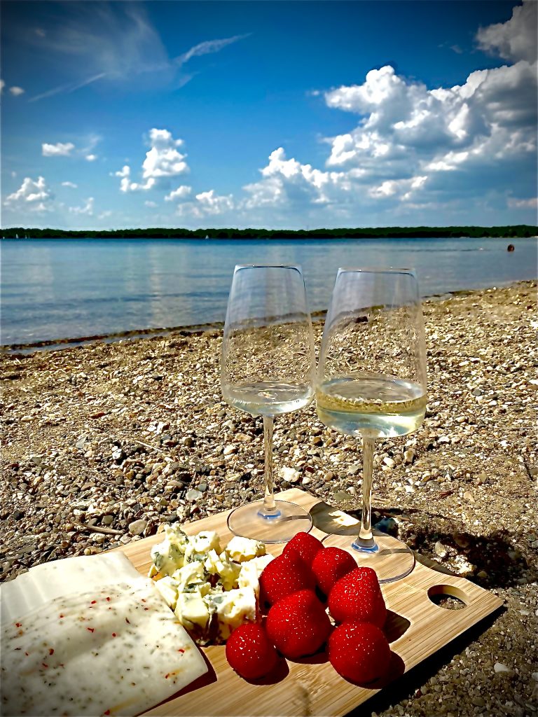 Am Strand angekommen, breite ich die Decke aus. Maria drapiert den Käse appetitlich auf einem Holzbrettchen, platziert noch ein paar Erdbeeren darauf, füllt die Weingläser und macht erst mal ein Foto für ihren Instagram-Account. Danach holt sie die Soundbar heraus und wir sind wieder mit unserem Grundproblem konfrontiert: sie mag keinen Indie und ich finde Miley Cyrus grausig – schließlich einigen wir uns auf Bruno Mars.